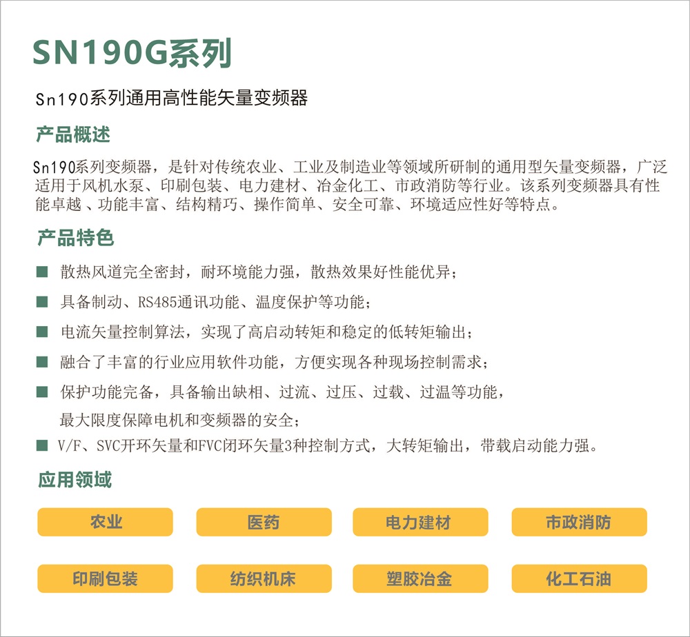 SN190G系列变频器, 是针对传统农业、 工业及制造业等领域所研制的通用型矢械变频器,广泛适用于风机水泵、 印刷包装、 电力建材、 冶金化工、市政消防等行业。 该系列变频器具有性能卓越、 功能丰富、 结构精巧、 操作简单、 安全可靠、 环境适应性好等特点。