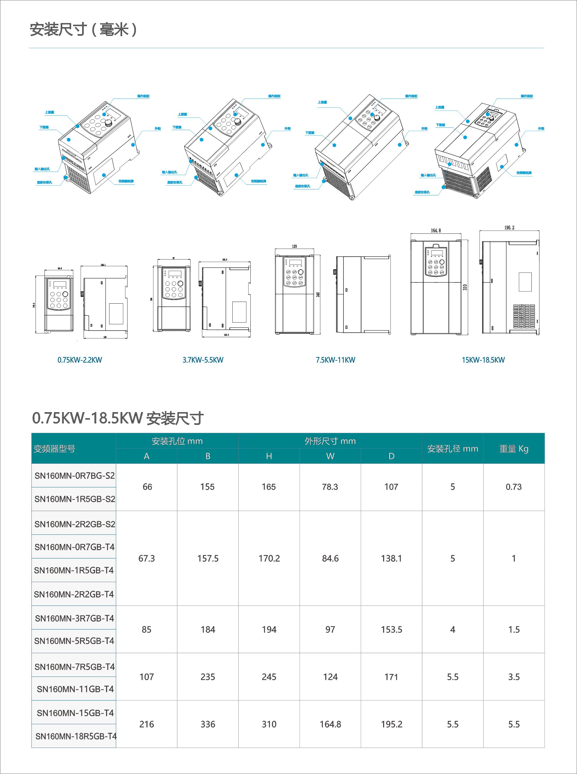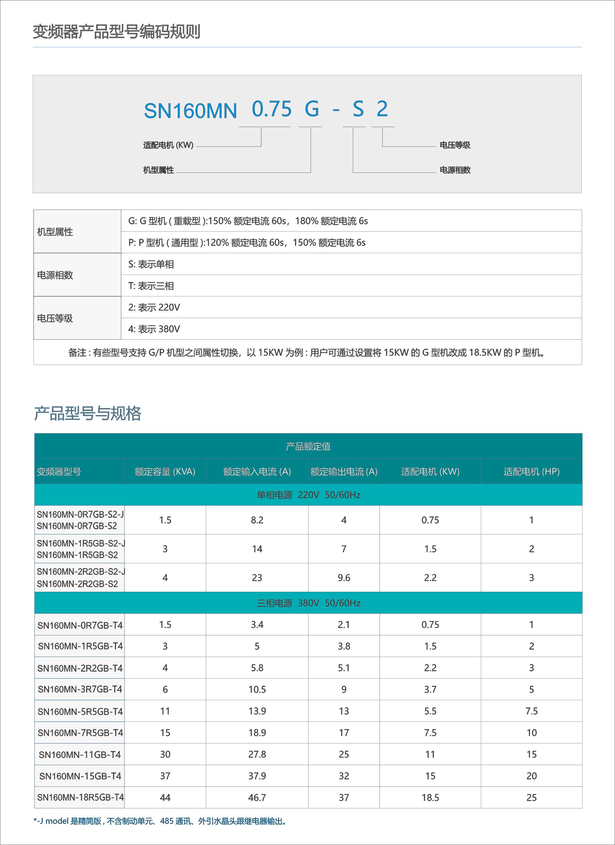 SN160MN系列是一款小型紧凑型的通用型变频器,支持开环矢量控制,PID,多段速,简易PLC等常用功能。